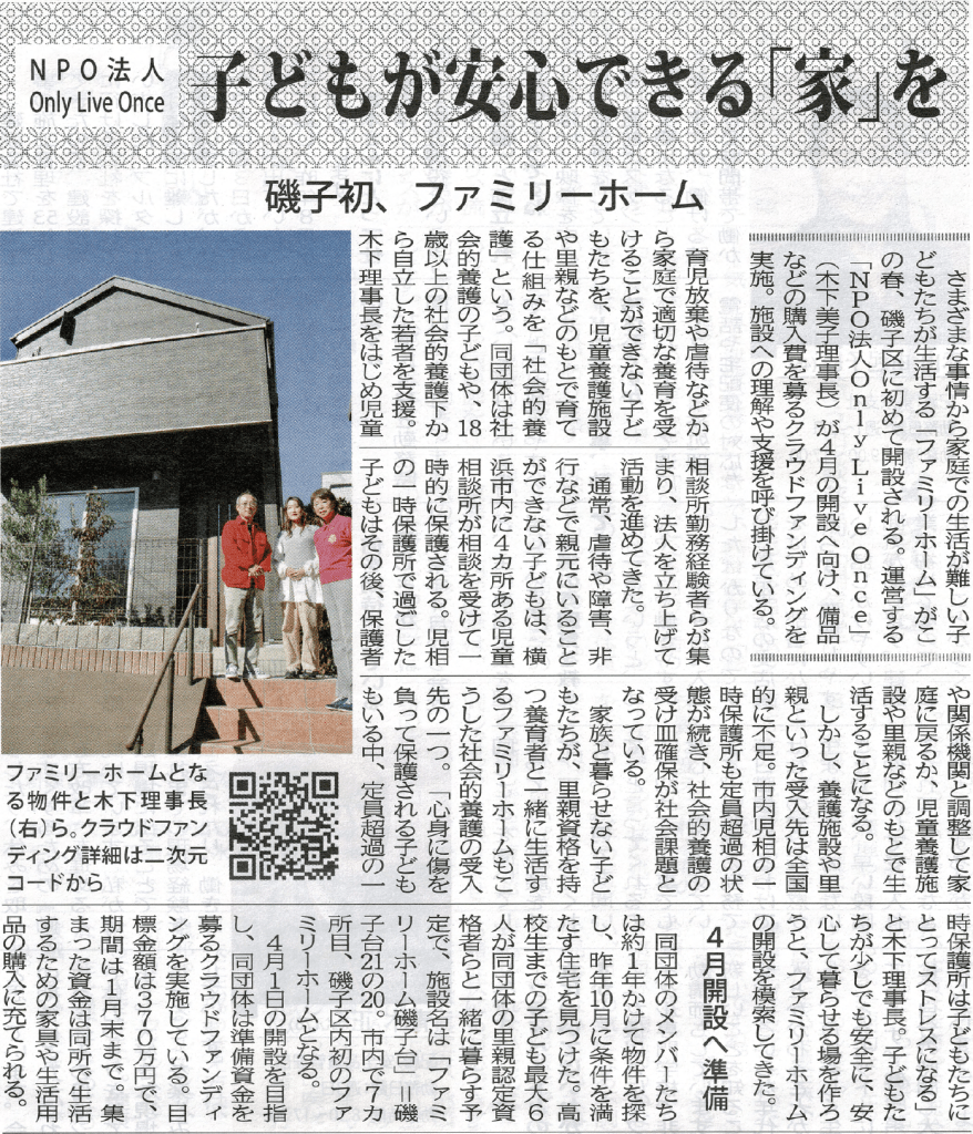 タウンニュースに掲載されました。 投稿者:onlyliveonce92024年1月3日2024年1月4日カテゴリー:未分類 Only Live Onceの取り組みがタウンニュースに掲載されました。2024年も弊団体をよろしくお願いいたします。 NPO法人Only Live Once「子どもが安心できる家を」ー 磯子初、ファミリーホーム 共有: クリックして X で共有 (新しいウィンドウで開きます) X Facebook で共有するにはクリックしてください (新しいウィンドウで開きます) Facebook いいね 読み込み中…