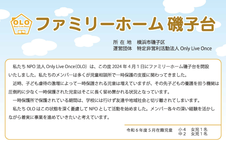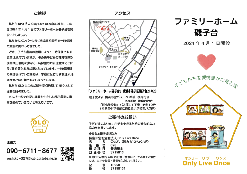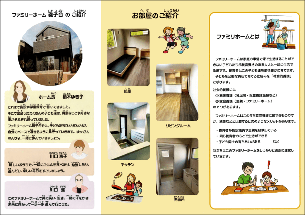 「ファミリーホーム磯子台」開設しました。 投稿者:onlyliveonce92024年6月10日2024年6月10日カテゴリー:未分類 2024年4月1日に「ファミリーホーム磯子台」が開設しました。詳細は下記の三つ折りパンフレットをご覧ください。 共有: クリックして X で共有 (新しいウィンドウで開きます) X Facebook で共有するにはクリックしてください (新しいウィンドウで開きます) Facebook いいね 読み込み中…