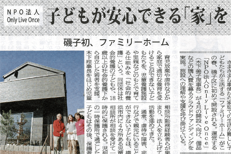 Only Live Onceの取り組みがタウンニュースに掲載されました。2024年も弊団体をよろしくお願いいたします。 NPO法人Only Live Once「子どもが安心できる家を」ー 磯子初、ファミリーホーム